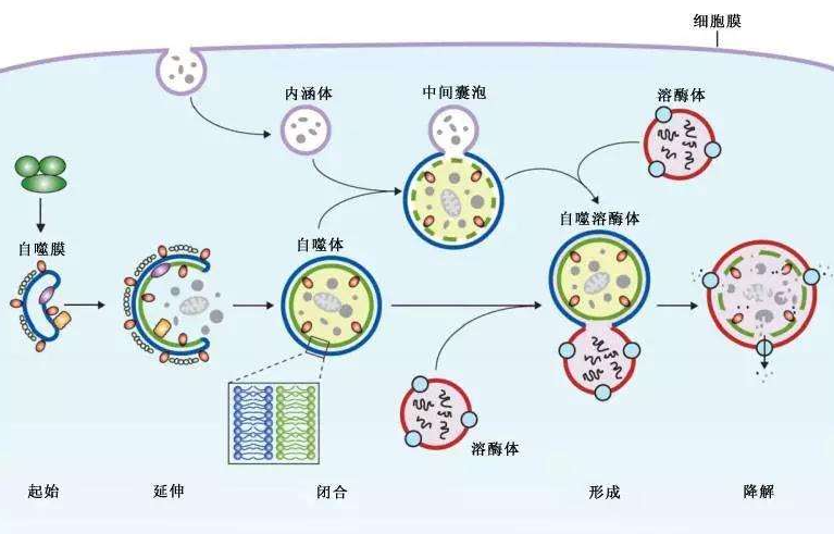 那么什么是细胞自噬?简单来讲,细胞自噬就是细胞的自我消化,将一些暂时用不上的组分降解回收,再经过重新组装成自己需要的东西,废物利用、更新换代。细胞通过这种自我调整机制来保持细胞活力。同时也是一种应对饥饿、机体感染等外界因素影响的应急机制,来维持机体稳态。